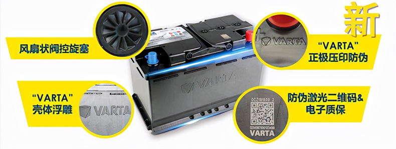 瓦尔塔蓄电池一直致力于产品的升级和改进,以提升车主体验。自2022年1月起,瓦尔塔AGM蓄电池进一步升级防伪设计。全新的瓦尔塔AGM蓄电池正极增加了“VARTA”品牌商标压印防伪标识,同时集合现有的风扇状阀控旋塞、防伪激光二维码及电子质保、电池壳体正面浮雕设计。升级后的瓦尔塔AGM蓄电池设计外观将帮助车主更直观清晰地辨识正品蓄电池。